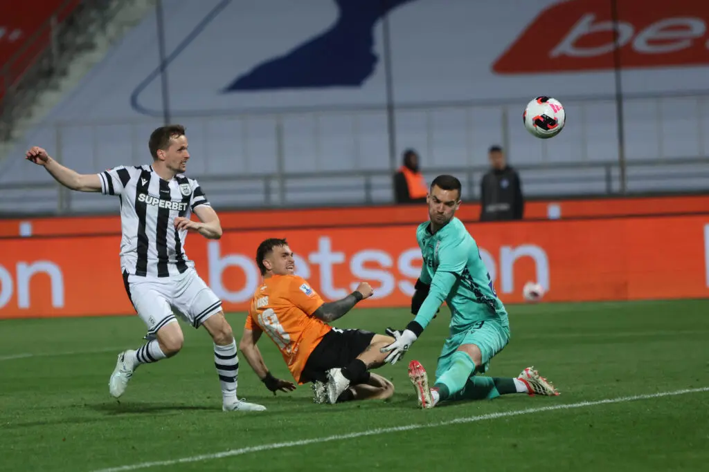 90+4’ Σέντρα σουτ του Τζωρτζινάκη η μπάλα παίρνει περίεργη τροχιά και χτυπάει στο δοκάρι του Κατσιμήτρου