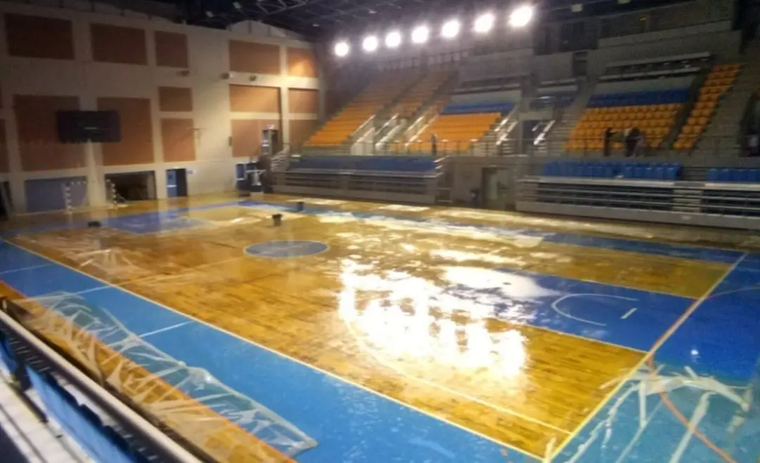 Η οροφή θυμίζει κυριολεκτικά «σουρωτήρι», με πολλαπλές διαρροές, γεγονός που έχει οδηγήσει σε εκτεταμένες ζημιές τόσο εντός του αγωνιστικού χώρου όσο και στο παρκέ, το οποίο σε μεγάλο βαθμό εμφανίζεται κατεστραμμένο.