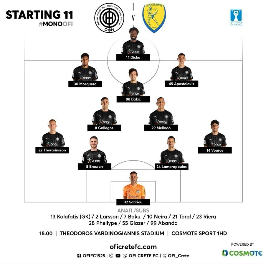 Με 4-2-3-1 παρατάσσει τον ΟΦΗ ο Πέπε Μελ στον αγώνα Κυπέλλου με τον Παναιτωλικό με αρκετές αλλαγές σε πρόσωπα στην αρχική ενδεκάδα.
