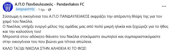 Βαρύ είναι το κλίμα στον Πανδαυλειακό της ΕΠΣ Βοιωτίας, μετά την είδηση της απώλειας του Νικόλα Κατσαμπέρη, ενός παιδιού που είχε συνδέσει το όνομά του με την ομάδα από πολύ νεαρή ηλικία.