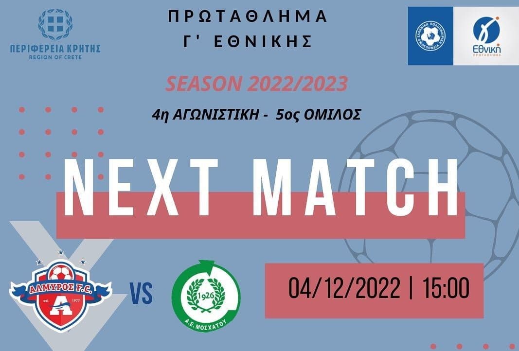 Η ομάδα μας αντιμετωπίζει την Κυριακή 04 Δεκεμβρίου και ώρα 15:00 το μεσημέρι την ομάδα του Μοσχάτου, στο εντός έδρας παιχνιδι στα πλαίσια της 4ης αγωνιστικής του Πρωταθλήματος της Γ Εθνικής.⚽️