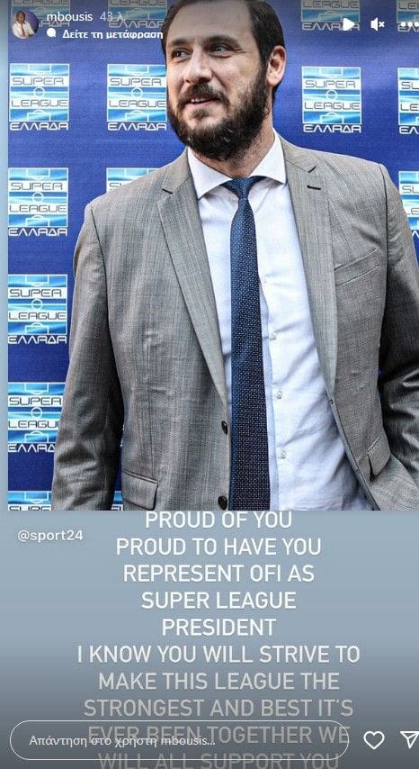 «Περήφανος για σένα. Περήφανος να σε έχουμε να εκπροσωπείς τον ΟΦΗ, ως πρόεδρος της Super League. Ξέρω ότι θα προσπαθήσεις να κάνεις τη λίγκα την δυνατότερη και την καλύτερη που έχει γίνει ποτέ. Μαζί θα σε στηρίξουμε».