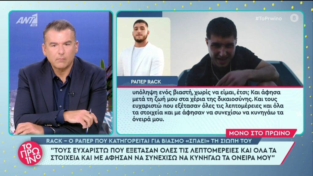 Ο διάσημος τράπερ Rack ο οποίος συνελήφθη με την κατηγορία για βιασμό φοιτήτριας στο Ρέθυμνο, «σπάει» τη σιωπή του. Για την κατηγορία σε βάρος του για βιασμό 19χρονης φοιτήτριας στο Ρέθυμνο, στις αρχές του Απριλίου αλλά και για τη δικαστική του περιπέτεια μίλησε για πρώτη φορά ο διάσημος τράπερ Rack, σε συνέντευξη που παραχώρησε στον ΑΝΤ1. Δείτε το Video: