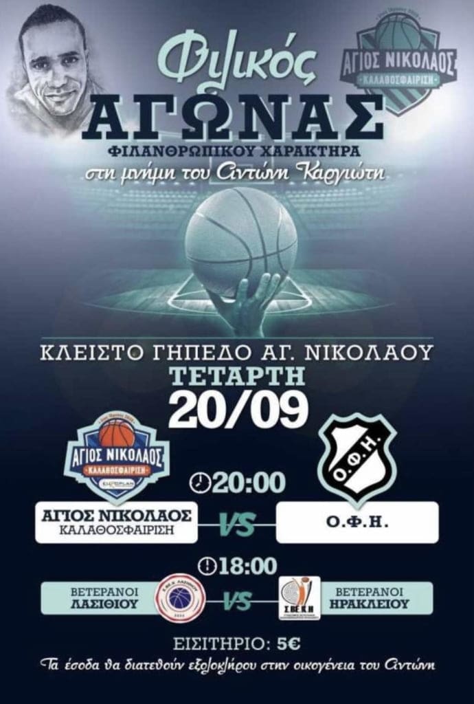 Ένα ξεχωριστό παιχνίδι φιλανθρωπικού χαρακτήρα στη μνήμη του Αντώνη Καργιώτη θα γίνει σήμερα το απόγευμα στο Κλειστό του Αγίου Νικολάου όπου η τοπική ομάδα του Αγίου Νικολάου θα αντιμετωπίσει τον ΟΦΗ στις 8 μ.μ . Νωρίτερα στις 6 μ.μ θα παίξουν οι Βετεράνοι του Λασιθίου με τους Βετεράνους του Ηρακλείου. Το εισιτήριο κοστίζει 5 ευρώ […]