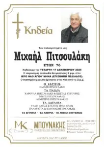 Ο Μιχάλης Πιτσουλάκης, πατέρας του δικού μας Δημήτρη, της Χαρούλας και του Νίκου, έφυγε από τη ζωή το βράδυ της Τρίτης, σε ηλικία 76 ετών.