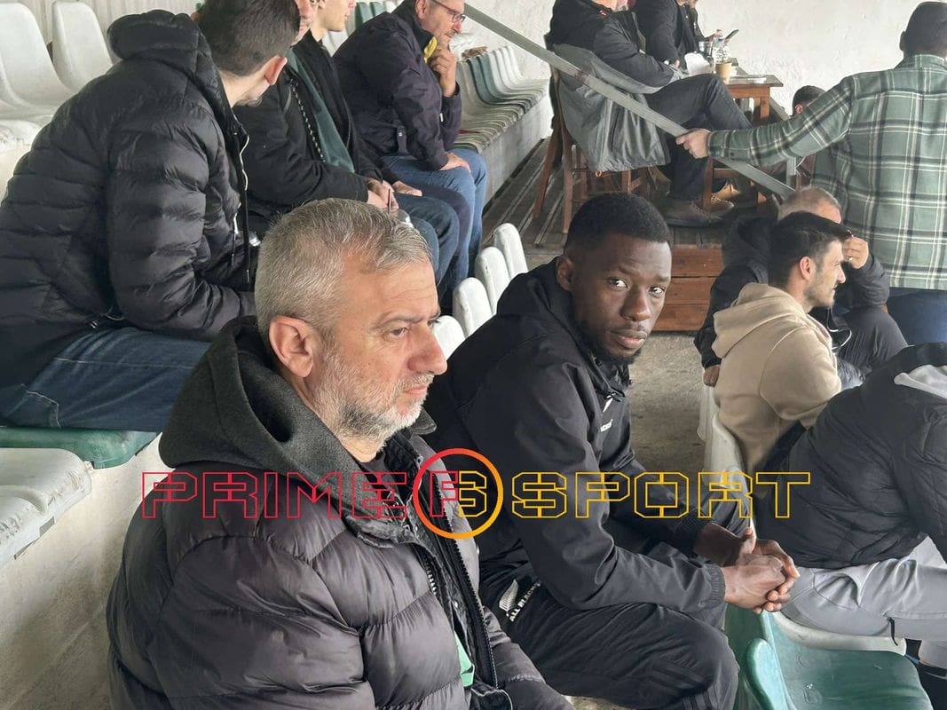 O Γιώργος Πολυχρονάκης παρακολουθεί το παιχνίδι του ΠΟΑ με τον Καραβά, έχοντας παρέα το νέο μεταγραφικό απόκτημα του Εργοτέλη, Μαχαμαντού Ντραμέ.