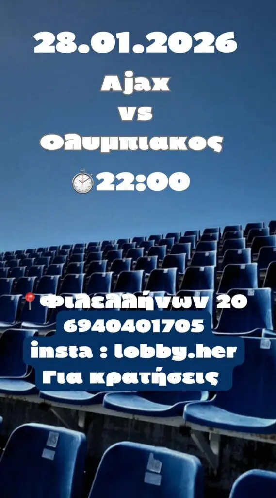 Έτσι την Τετάρτη στις 10 το βράδυ το Lobby σας περιμένει για να δείτε από κοντά τη μεγάλη αναμέτρηση του Άγιαξ με τον Ολυμπιακό για το Champions League πίνοντας το ποτό η τον καφέ σας και απολαμβάνοντας μια πλούσια ποικιλία από σνακ σε έναν πολύ όμορφο χώρο που βρίσκεται στην Κηπούπολη στην Οδό Φιλελλήνων 20.