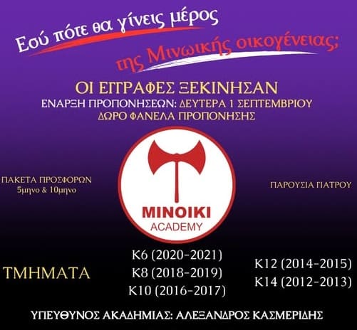 Επικοινώνησε στο 6944008095 (Νιρέας Φουντουλάκης) ή στείλε μήνυμα στη Minoiki Academy σε Facebook ή Instagram!