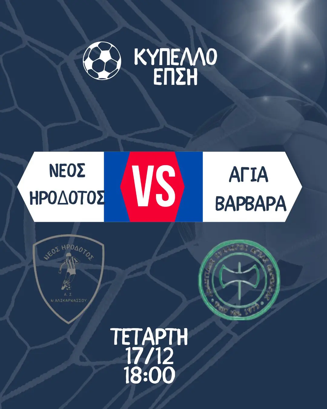 Παιχνίδι Κυπέλλου δίνει την Τετάρτη το απόγευμα ο Νέος Ηρόδοτος με αντίπαλο την Αγία Βαρβάρα (18:00) στο γήπεδο “Γ. Σκουρέλλος”.