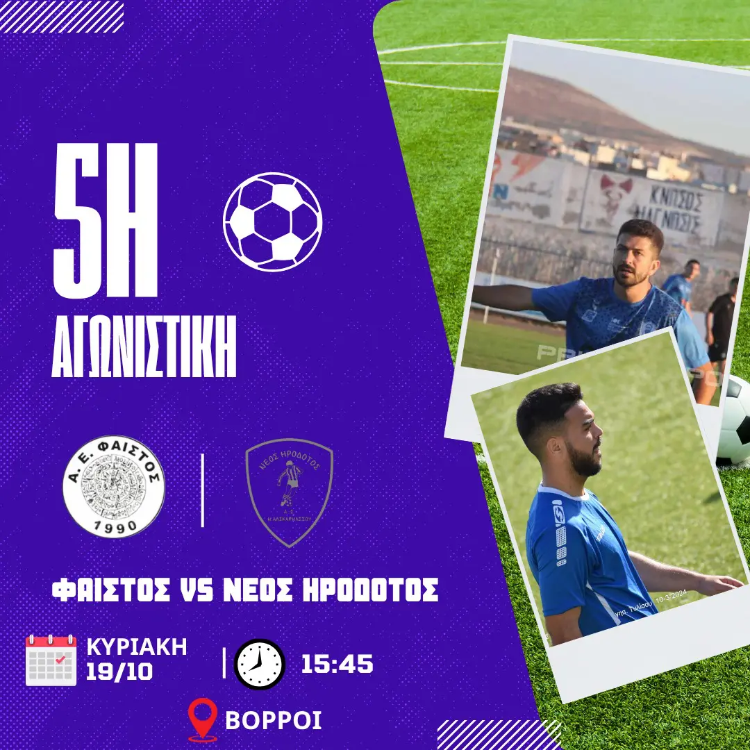 “🔵⚪️Ο Νέος Ηρόδοτος αγωνίζεται την Κυριακή στους Βόρρους, για την 5η αγωνιστική του πρωταθλήματος, με αντίπαλο τη Φαιστό. Ο αγώνας θα ξεκινήσει στις 4 παρά τέταρτο το μεσημέρι.