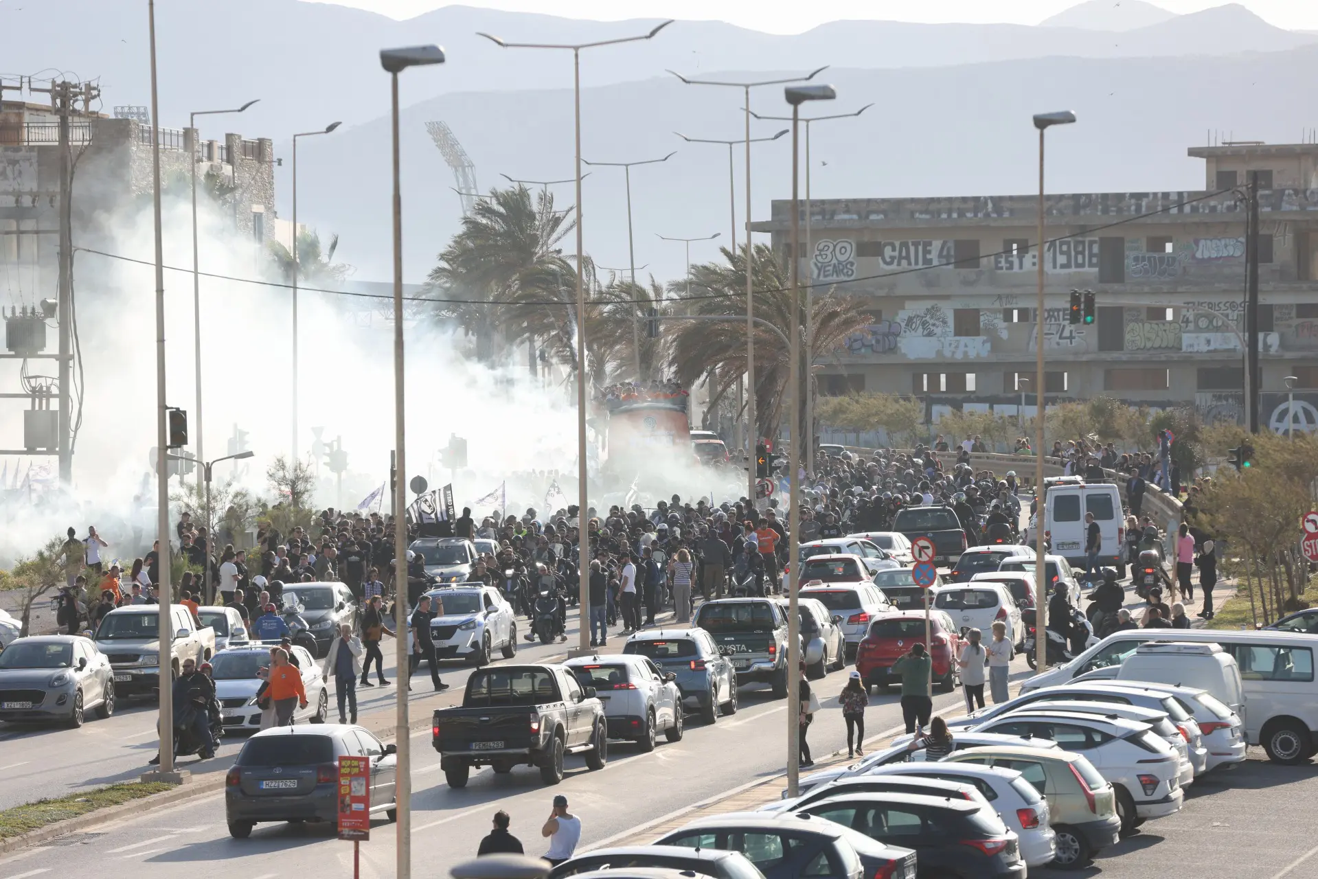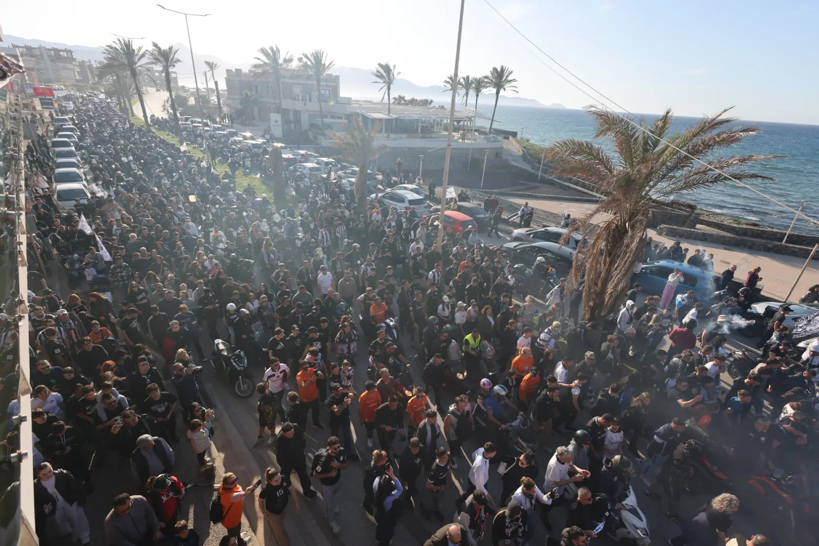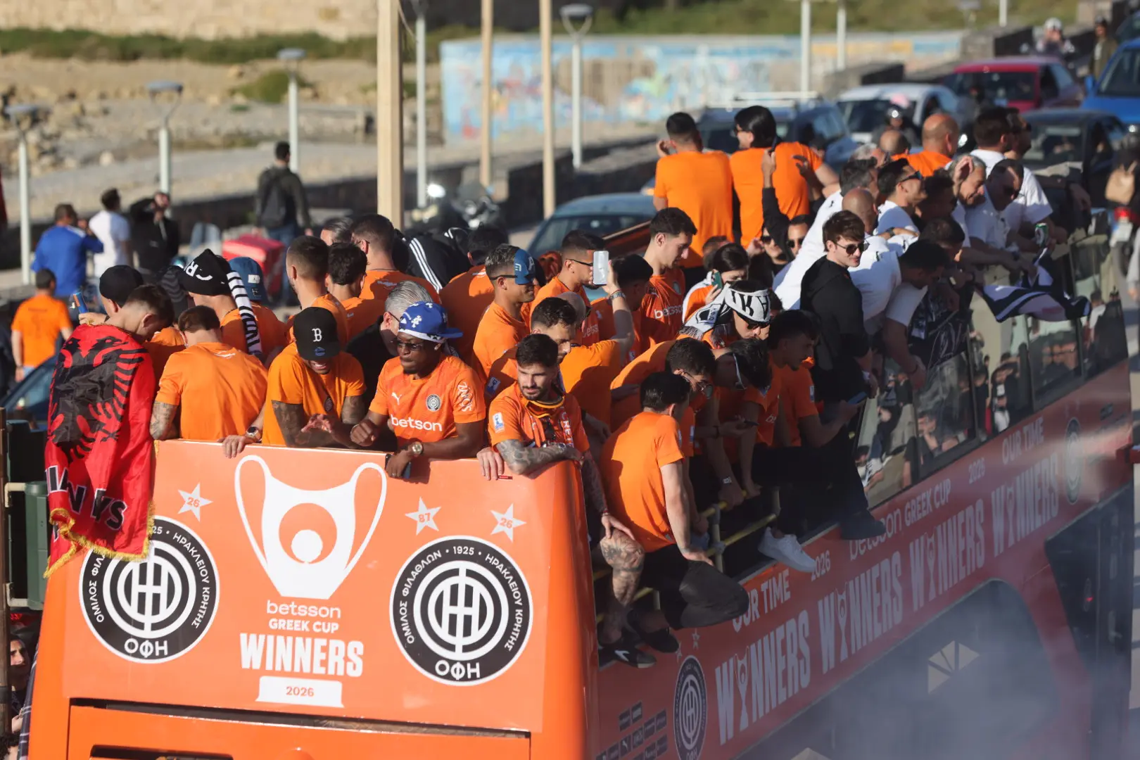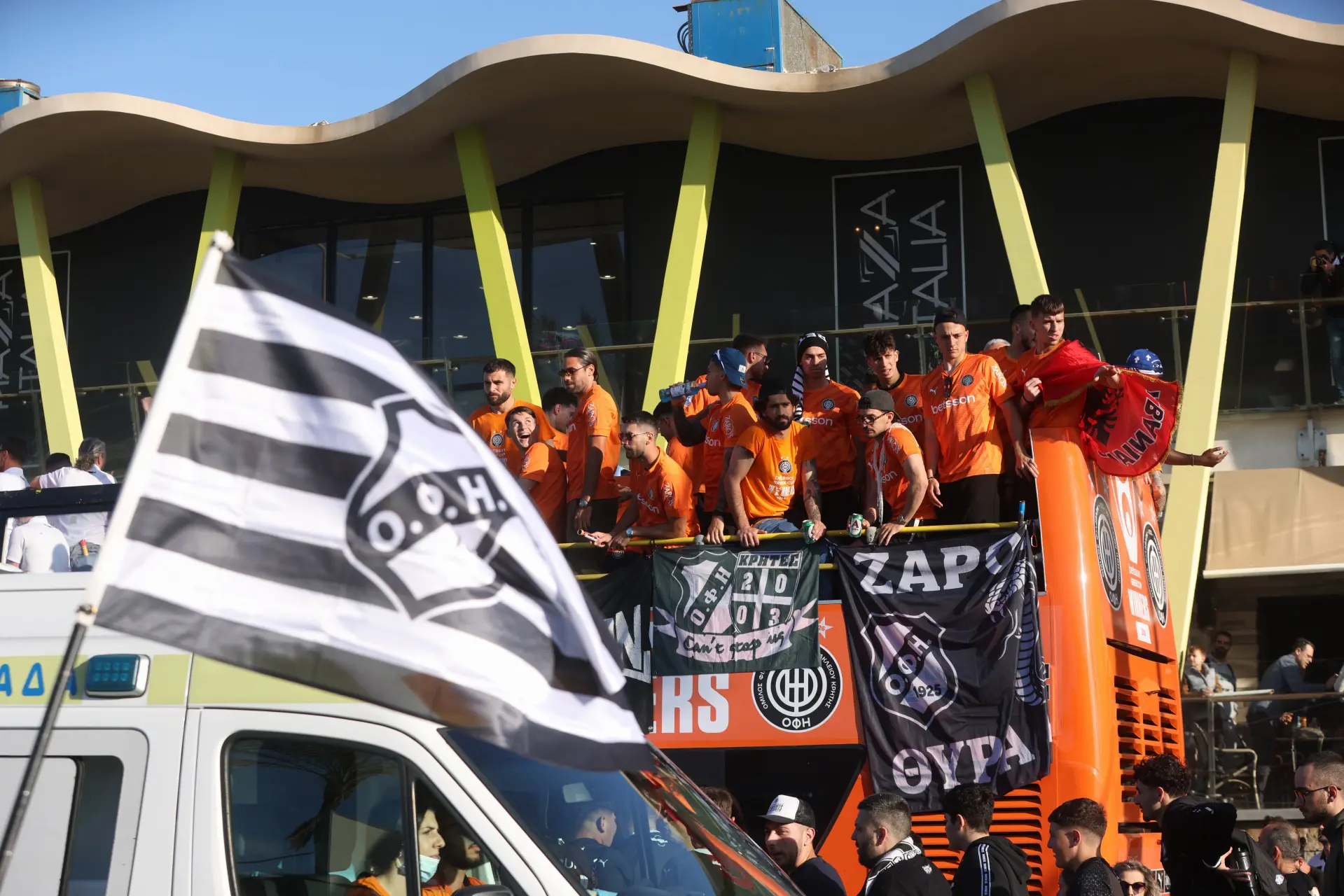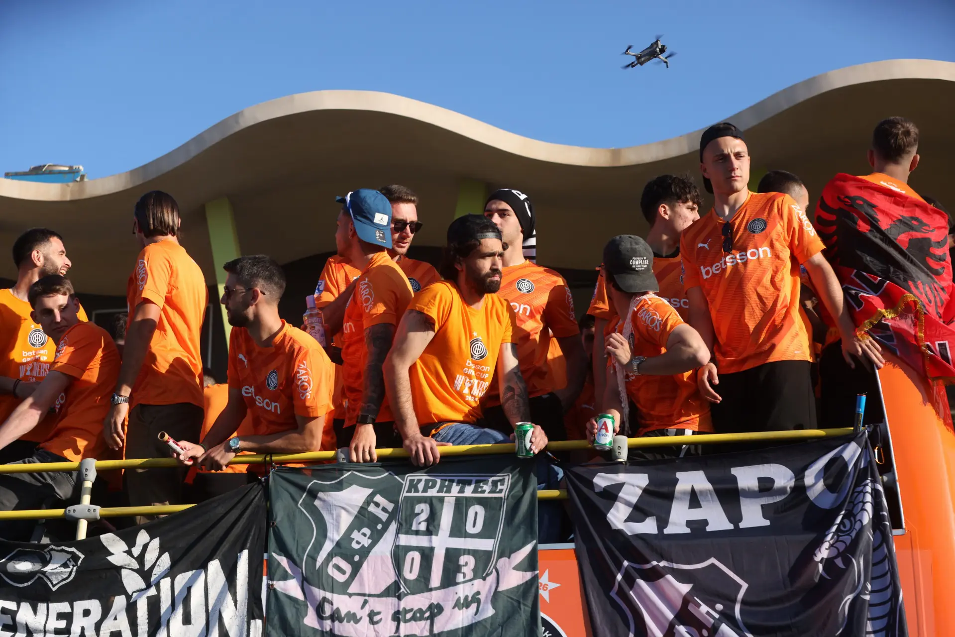 Ένα πραγματικό πανδαιμόνιο επικρατεί στη φιέστα του ΟΦΗ, με εικόνες που κόβουν την ανάσα και ξεχειλίζουν συναίσθημα, πρωτόγνωρες για την πόλη του Ηρακλείου και σπάνιες ακόμη και για τα ελληνικά δεδομένα. Οι φίλοι του ΟΦΗ έχουν κατακλύσει κάθε γωνιά των δρόμων, οι οποίοι έχουν «πνιγεί» από κόσμο, δημιουργώντας ένα ασπρόμαυρο ποτάμι που πάλλεται από ενθουσιασμό.