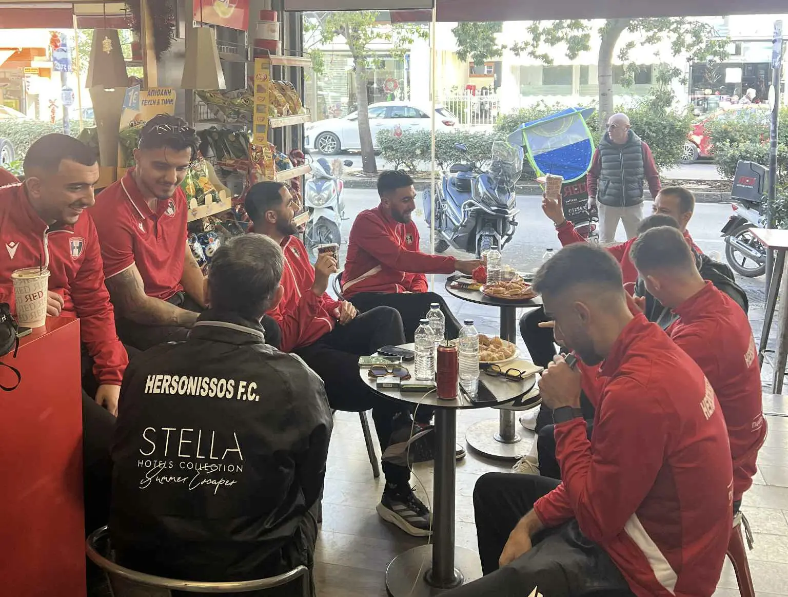 Η αποστολή της Χερσονήσου, πριν μεταβεί στο Lido Soccer όπου θα διεξαχθεί το παιχνίδι με το Λίντο για τη 13η αγωνιστική της Α1 ΕΠΣΗ, απόλαυσε ένα καλό καφέ, πριν την καλέσει το… καθήκον.