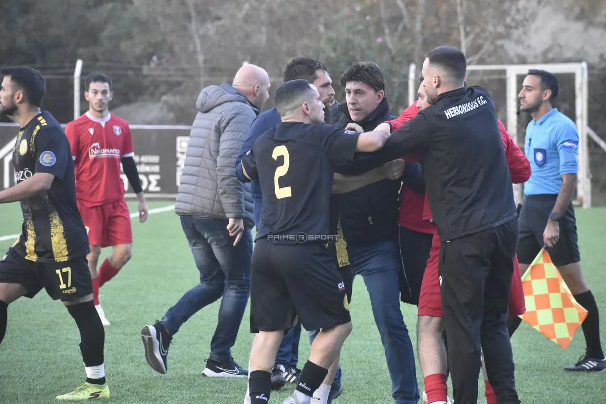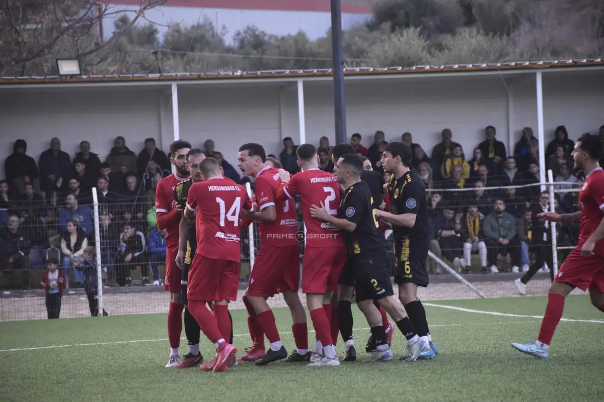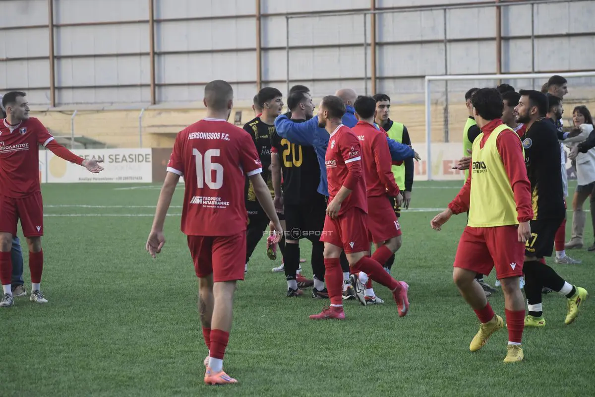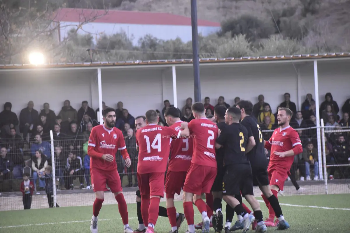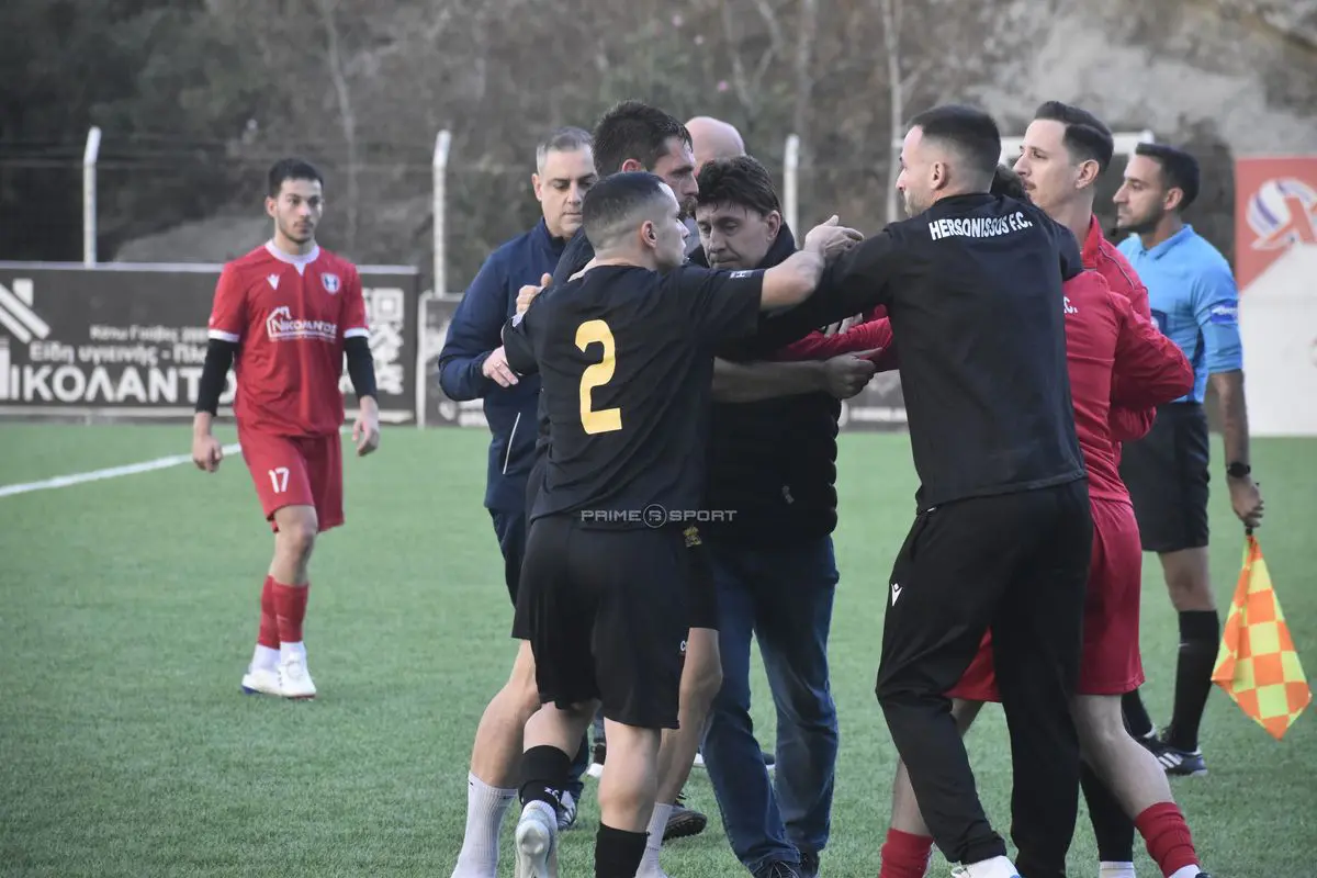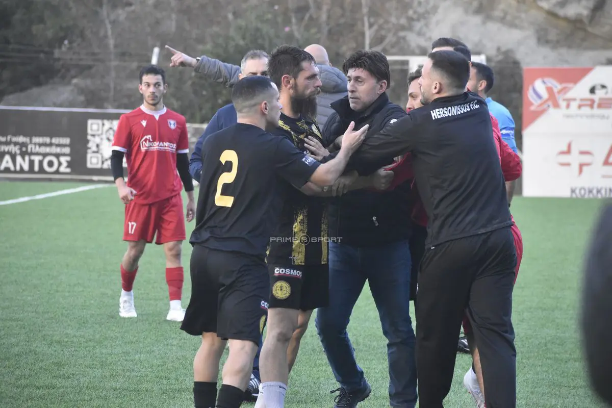 Η αναμέτρηση είχε ένταση, δυνατές μονομαχίες και στιγμές που θύμισαν μάχη σώμα με σώμα, στο γήπεδο της Χερσονήσου, με αποβολές, τόσο ποδοσφαιριστών όσο και του προπονητή του Εργοτέλη, Ηλία Κώτσιου, αφού ο αγωνιστικός χώρος για λίγα λεπτά είχε μετατραπεί σε… πεδίο μάχης.